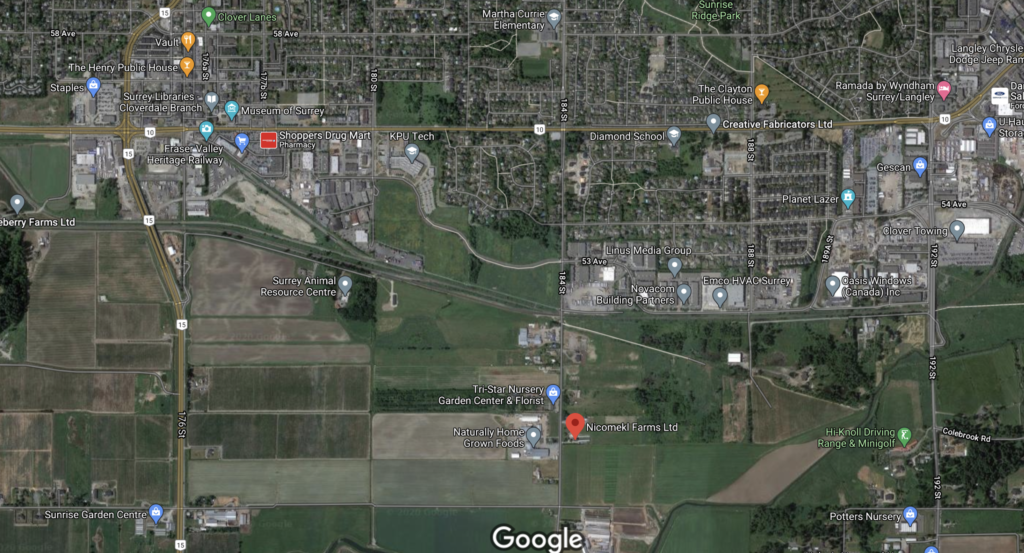 Location of Nicomekl Farm (red marker) in Surrey just south of Cloverdale and southwest of Langley City